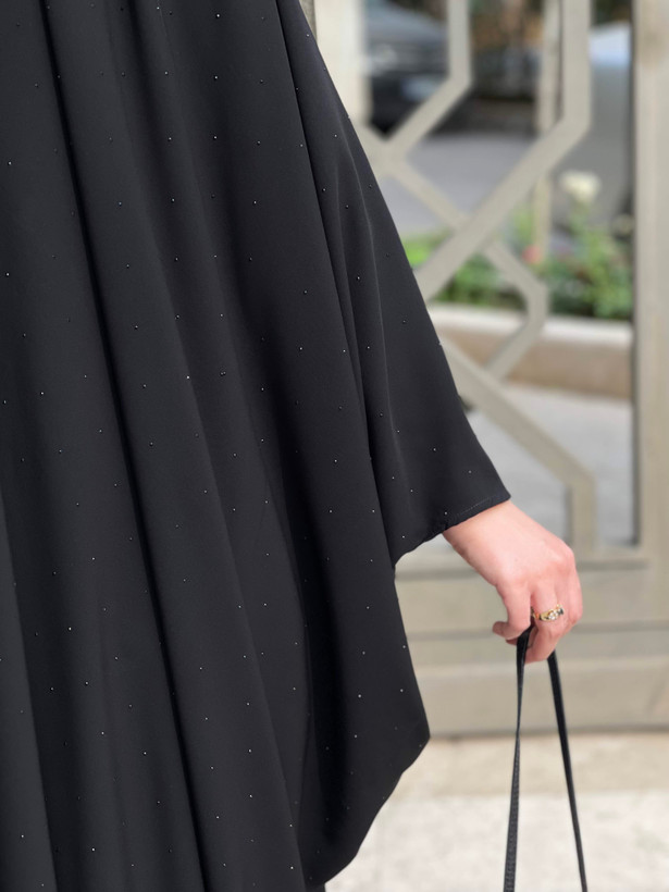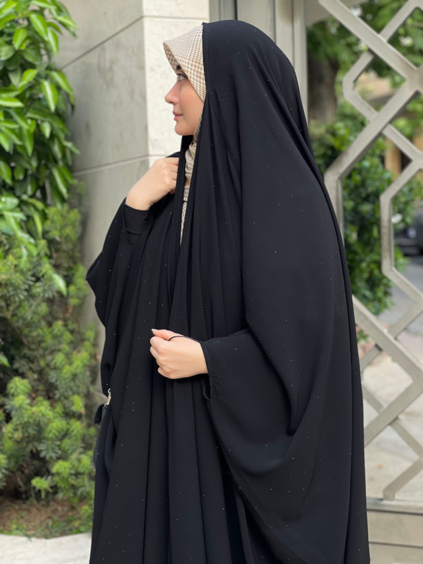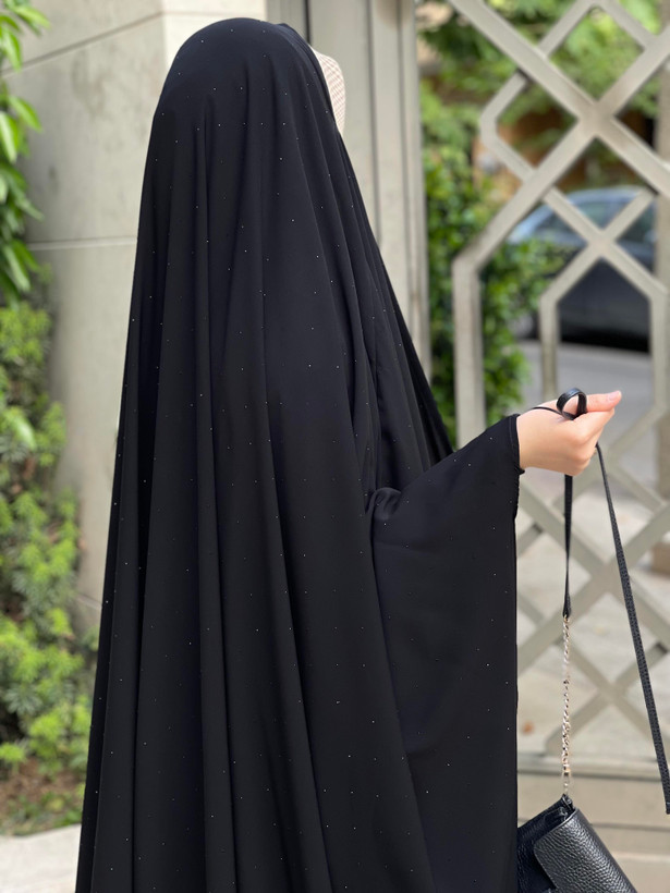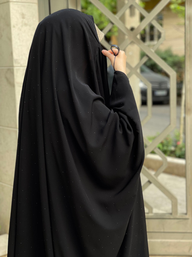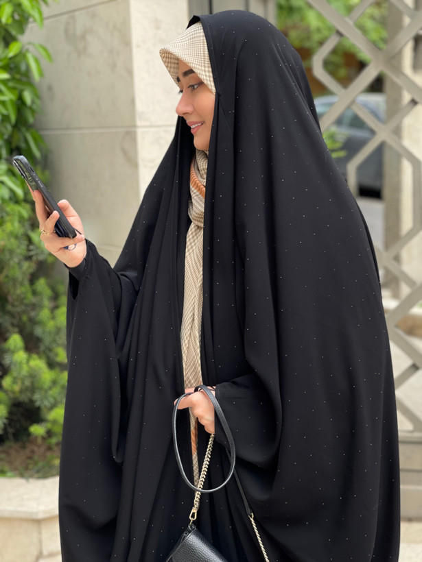 دارای نگین های منحصر به فرده و مثل قطرات باران روی تمام قسمت های چادر پخش شده و جلوه فوق العاده زیبایی به چادر داده و براقیت جذاب و خاصی داره، این نگین ها اصلا چادر رو سنگین نمیکنن. و ریزش نگین ها در حده صفره